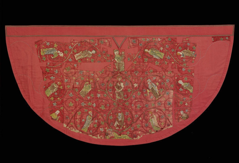 The fragments of the cope are embroidered with silver-gilt and silver thread and coloured silk, and worked in underside couching and split stitch, with laid and couched work. The ground material is silk reinforced with linen. The embroidery represents the Tree of Jesse. A vine springs from the body of Jesse (according to the Bible he was the father of David), and shelters prophets and ancestors of Jesus. Each figure is identified with an embroidered name.