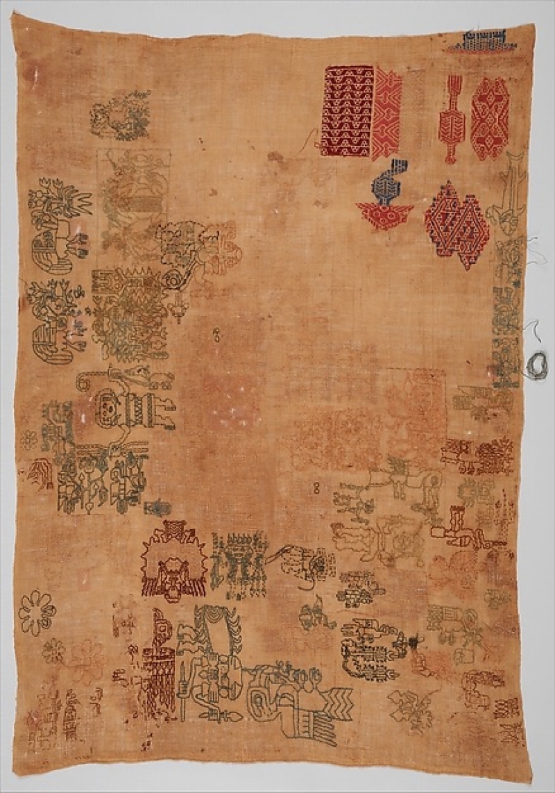 An early form of a needlework sample (often classed as a sampler) from Nasca, Peru, is kept in the Metropolitan Museum of Art, New York (USA). The sample dates to the second century BC. It is 105 x 72 cm in size. A sample is a piece of cloth on which motifs and stitches are worked out in a random manner. The aim of this type of textile is to act as a private ‘sketch pad’ to remind the embroiderer of techniques and ideas.