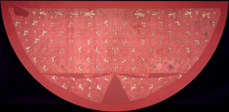 The imperial mantle (Paludamentum Imperiale) associated with Otto IV probably dates from between 1209-1214. It has a red silk ground that is embroidered in opus anglicanum, an embroidery technique that uses underside couching of gold and silver thread. The mantle is decorated with embroidered medallions of Christ and the Virgin, as well as individual figures and motifs, such as angels with incense holders, crescents, suns and lions (passant guardant).