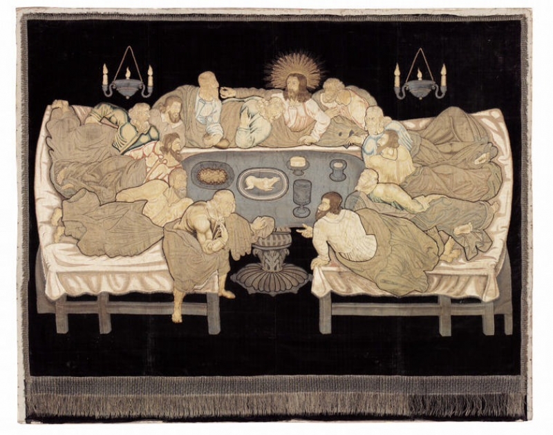 By 1618 Harrison was working for James I, but he only officially bore the title of King’s Embroiderer from 1621 onwards. Harrison is known to have produced various embroideries for Charles I, including rich, figured altar cloths and hangings. There is a Nativity embroidery worked in or nué technique attributed to Harrison, now in the Victoria and Albert Museum, London (acc. no. T.147-1930), an embroidered altar dossal with the Last Supper (acc. no. T.206-2009); another frontal, also attributed sometimes to Harrison, carries the arms of Sandys of the Vyne (with the date 1633; acc. no. T.108-1963).