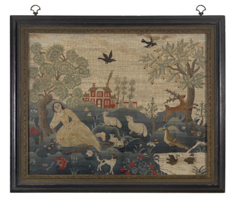 Other images in this ‘series’ included men and women walking together, men on horseback, shepherdesses, women spinning, birds, animals and idealised landscapes. The Esther Stoddard picture, for instance, is an example of this embroidery genre. The Stoddard picture depicts a sleeping woman (a shepherdess) in a landscape filled with animals, birds, a large house, pond and so forth.