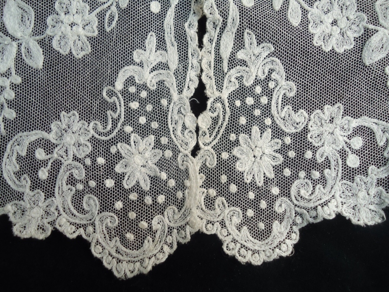 This type of lace used both tambour and needlerun techniques, often on the same item of lace, in addition to many different filling stitches. According to the British lace historian, Pat Earnshaw, for instance, there was one Limerick lace collar that was decorated using 47 different filling stitches (1984:102). In addition, needlerun forms were often combined with tamboured outlines to add further contrast.
