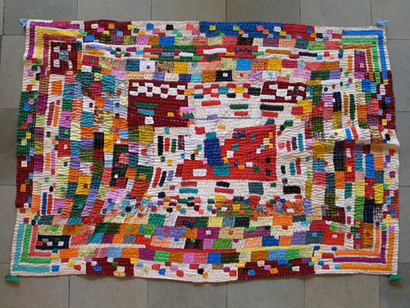 Kawandi are normally made of pieces of cloth from old, worn-out clothing gathered together by the quilters from family, friends or from items purchased at the local used-clothing markets. Some women incorporate parts of garments, such as the neckline of a child’s blouse or an old shirt (sometimes with the buttons still attached). Other women may cut the garments into small square or rectangular patches of brightly coloured cloth (tikeli). The tikeli are often placed on top of other, larger patches to create a series of layers in contrasting colours. When the quilters have enough pieces of cloth to make a quilt, a cotton sari is acquired and used as the backing for the quilt.