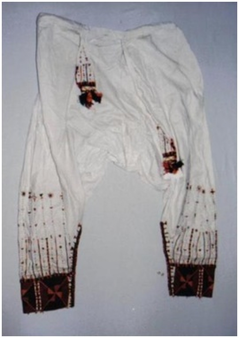The trousers are normally held in place at the waist with a cloth band (dequet), which is decorated at both ends with small bands of embroidery and tassels (jeshushet).