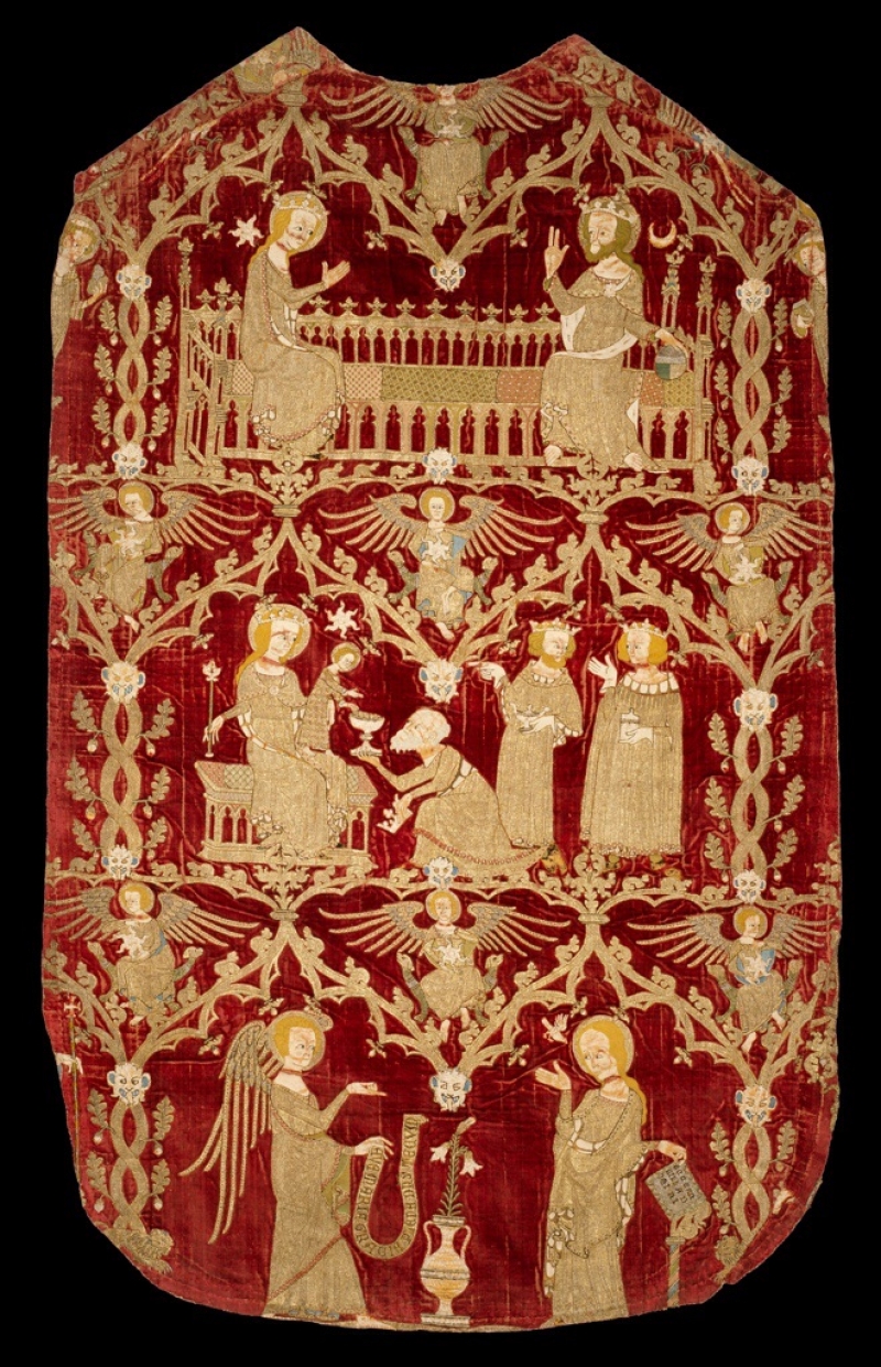 Underside couching for opus anglicanum was a technique whereby the gold thread was laid on the surface of the two or three layers of cloth and held taut (either in the hand or on a frame). A linen thread was then brought up through the layers of cloth and allowed to encircle the metal thread lying on the top. The linen thread was returned to the back of the layers through the same hole. The linen thread was pulled gently until a loop of gold thread appeared on the back of the linen layer. Any of the thin, third layer of cloth that was not covered with stitching was cut away when the embroidery was completed.