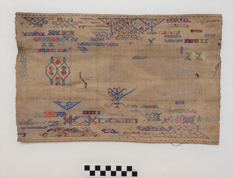 This type of cloth was worked by Miao girls who were being trained to weave patterned weft designs (supplementary weft compound tabby motifs), to learn the nature of the woven motifs. These patterns could also be used for embroidery if necessary, but this is not their primary function. The ground material is cotton, and the stitching is worked in silk.