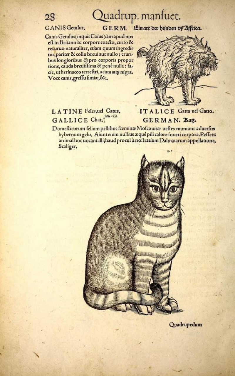 Gesner was also the author of Historiae animalium, a 4,500 page four-volume encyclopaedia that appeared between 1551-1558, including Quadrupeds (1551), Amphibians (1554), Birds (1555) and Fishes (1558). A fifth folio on snakes appeared in 1587. Icones Animalium is an abbreviated version of the first two histories (Quadrupeds and Amphibians). It was first published in 1553, with a second edition appearing in 1560. The book was used by some European embroiderers as a source of patterns for their work. For example, the catte embroidery by Mary Queen of Scots (part of the Oxburgh embroidered hangings), derives from this source.