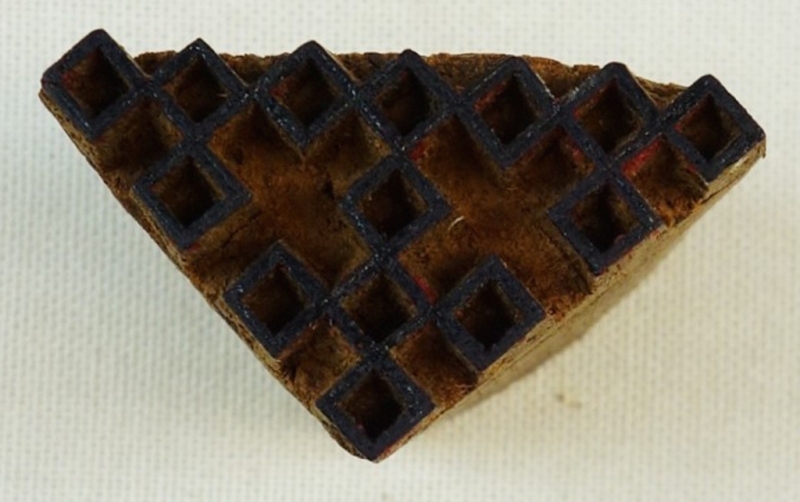 The Textile Research Centre in Leiden, The Netherlands, houses a remarkable set of a printing block and two embroidery samples. The printing block and the samples (one of which is a sari band) and the other a test piece) originate from India and they date to the early 21st century. The printing block, illustrated here, measures about 4 x 3 cm.